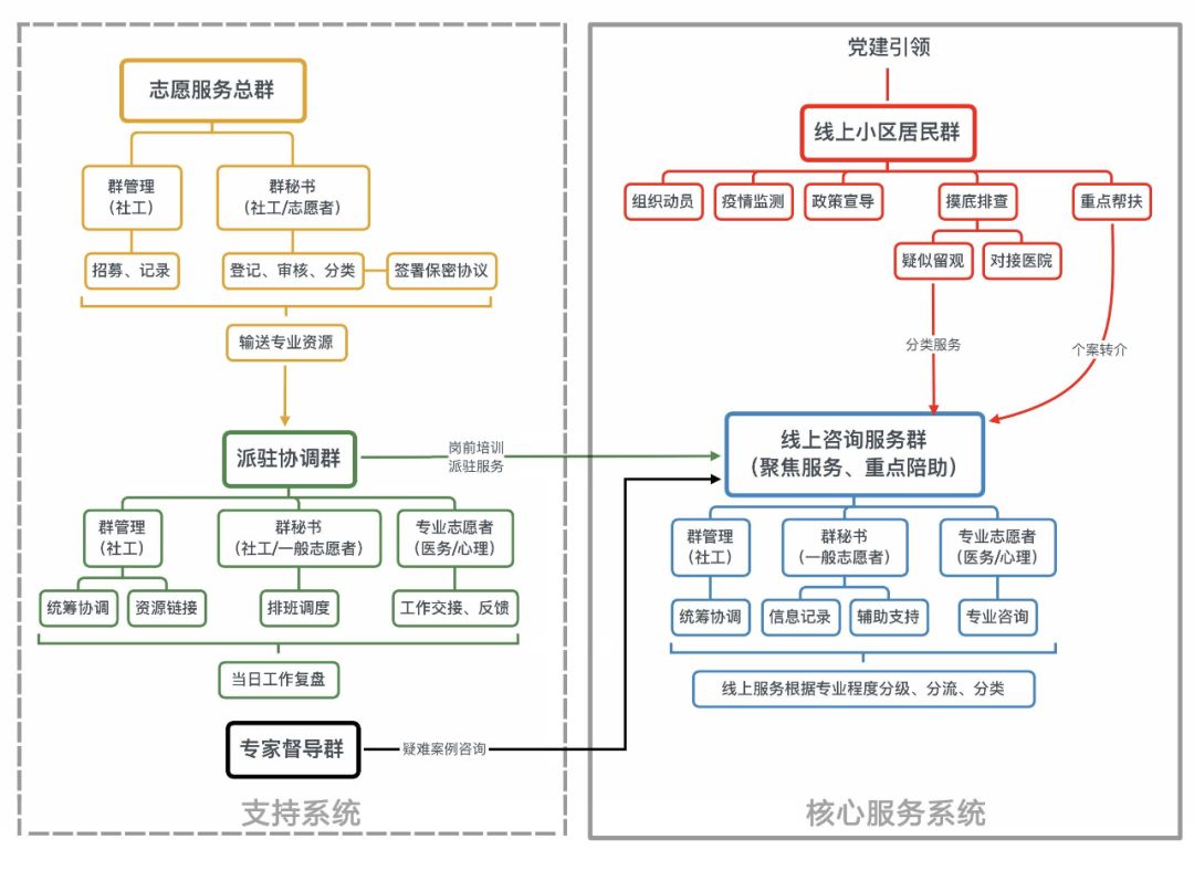2.对居民中居家/集中隔离人员及家属、疑似患者、严重焦虑者,以及心理压力较大的社区工作者转介建立聚焦服务群、重点陪助群等线上咨询服务群,由专业志愿者提供心理支持、情绪疏导、危机干预、健康咨询等服务,一般志愿者做好线上咨询服务群的日常管理,社会工作者做好资源链接、个案辅导、个案管理等服务,并负责线上咨询服务群的协调统筹。
