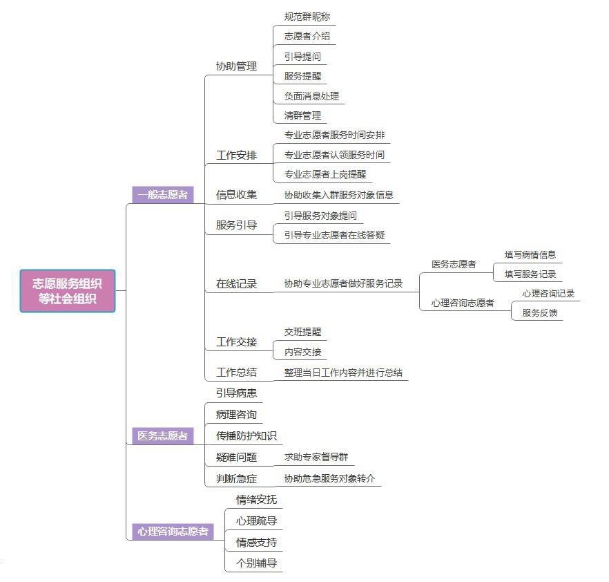 1.医务志愿者:轮班值守微信群;积极引导服务对象在线问诊、提供病理咨询、传播防护知识、在线答疑;根据现有条件减缓不适症状、纾解服务对象焦虑情绪、提供专业建议、进行专业指引;判断急症,及时与专业社工(群管理员)进行沟通,协助危急服务对象及时转介。